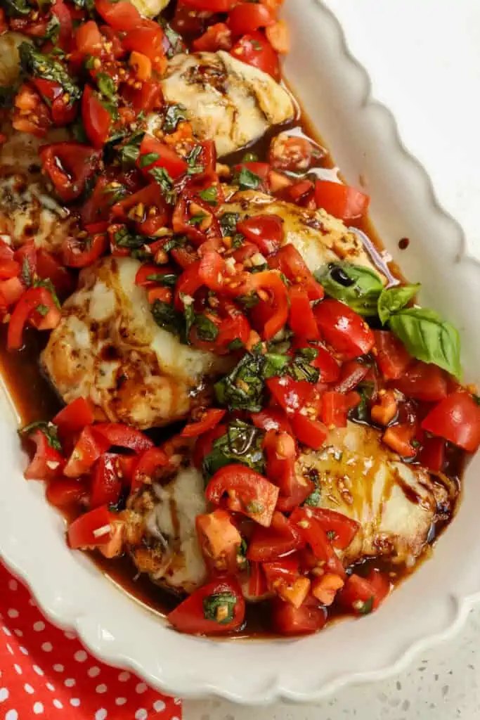 Простий рецепт з курячими брускеттами Золотисті італійські приправлені курячі грудки посипають свіжою брускеттою та поливають солодким бальзамічним вінегретом. інгредієнти Бальзамічна глазур 1 стакан бальзамічного оцту ⅓ склянки коричневого цукру Приправа для брускетти 2 склянки нарізаних кубиками помідорів 3 зубчики часнику подрібнити ½ чайної ложки кошерної солі ¼ чайної ложки свіжомеленого чорного перцю 1 столова ложка … Read more